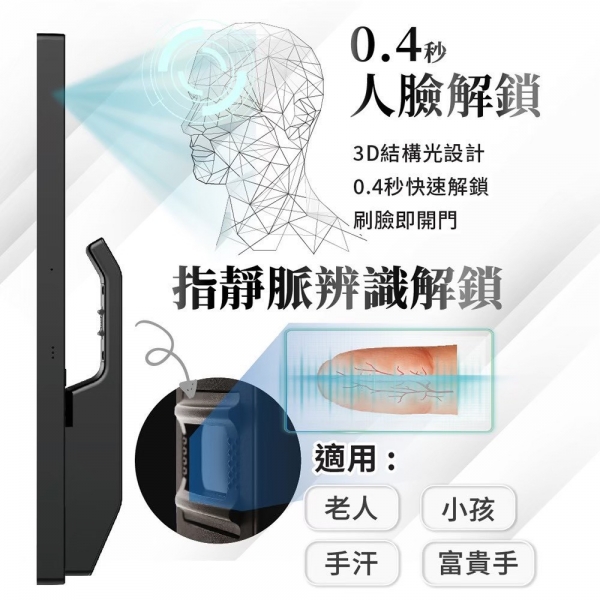 指靜脈無接觸辨識、AI 3D 活體人臉辨識、0.4 秒高速解鎖、PIR 異常偵測、身高辨識範圍 1.3–1.9m、手機推播警示、3D 結構光技術 |