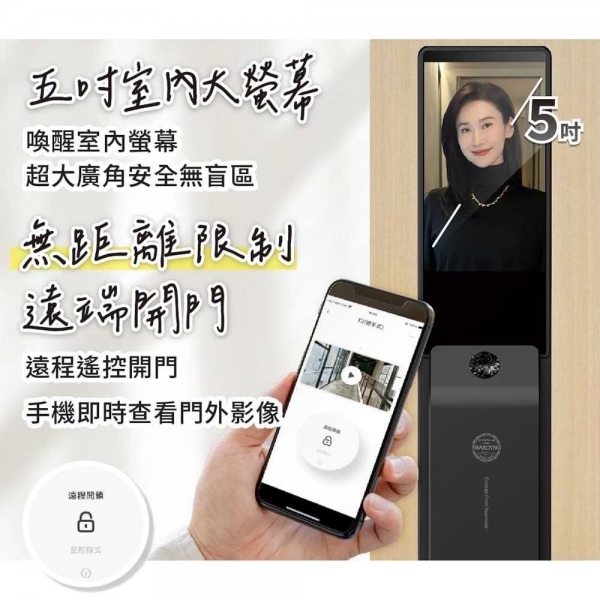 百萬畫素電子貓眼、5 吋室內顯示螢幕、APP 即時影像查看 |